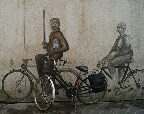 Tag: biciclette, ruote, spada, murales, manubrio, bici, borsa, sella, bicicletta, raggi, muro, sellino, murale, disegno, cestino, due, ciclisti.