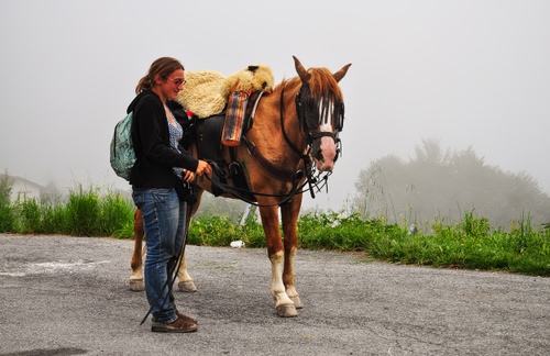 Osiglia, tra la nebbia l'abitante del borgo accarezza il suo cavallo.