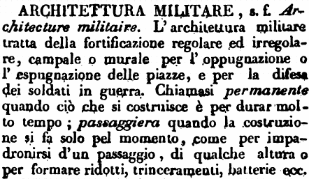 | Architettura militare - s. f. Architecture militaire. L'architettura militare tratta della fortificazione regolare ed irregolare, campale o murale per l'oppugnazione o l'espugnazione delle piazze, e per la difesa dei soldati in guerra. Chiamasi permanente quando ciò che si costruisce è per durar molto tempo; passaggiera quando la costruzione si fa solo pel momento, come per impadronirsi d'un passaggio, di qualche altura o per formare ridotti, trinceramenti, batterie ecc. [immagine] |