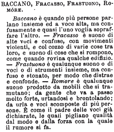 Baccano, Fracasso, Frastuono, Romore - Baccano è quando più persone parlano insieme ed a voce alta, ma confusamente e quasi l'uno voglia sopraffare l'altro. - Fracasso è suono di alte voci e confuse, con movimenti violenti, e col cozzo di varie cose tra loro, e suono di cose che si rompono, come quando rovina qualche edifizio. - Frastuono è qualunque suono o di voci o di strumenti insieme, ma confuso e stonato, per modo che distrae e confonde. - Romore è qualunque suono prodotto da mobili che si tramutano; da gente che va a passo molto forte, urtandosi e brontolando; da urla e voci scomposte di più persone. E' come il padre delle voci già dichiarate, le quali pigliano qualità dal modo e dalla forza con la quale il rumore si fa. [immagine]