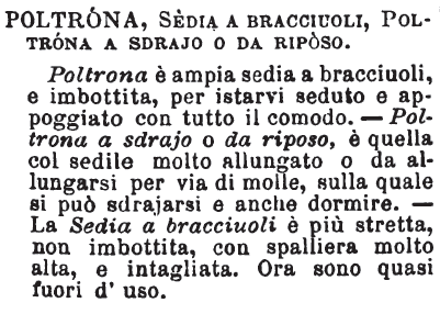 Poltrona, Sedia a Bracciuoli, Poltrona a sdrajo o da riposo - Poltrona è ampia sedia a bracciuoli, e imbottita, per istarvi seduto e appoggiato con tutto il comodo. - Poltrona a sdrajo o da riposo, è quella col sedile molto allungato o da allungarsi per via di molle, sulla quale si può sdrajarsi e anche dormire. - La Sedia a bracciuoli è più stretta, non imbottita, con spalliera molto alta, e intagliata. Ora sono quasi fuori d'uso. [immagine]