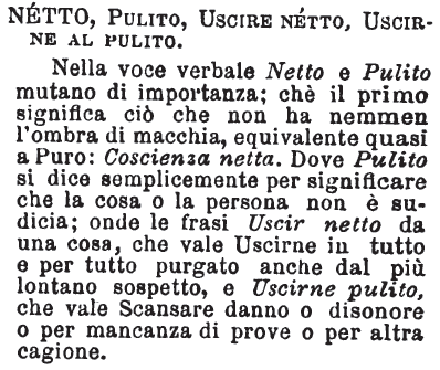 | Netto, Pulito, Uscire netto, Uscirne al pulito - Nella voce verbale Netto e Pulito mutano di importanza; chè il primo significa ciò che non ha nemmen l'ombra di macchia, equivalente quasi a Puro: Coscienza netta. Dove Pulito si dice semplicemente per significare che la cosa o la persona non è sudicia; onde le frasi Uscir netto da una cosa, che vale Uscirne in tutto e per tutto purgato anche dal più lontano sospetto, e Uscrine pulito, che vale Scansare danno o disonore o per mancanza di prove o per altra cagione. [immagine] |